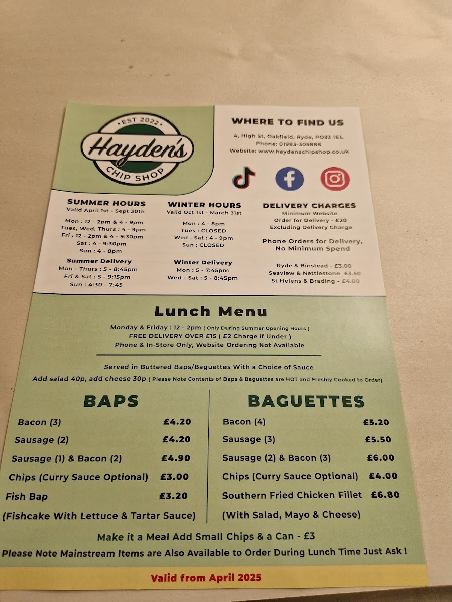 Welcome to Hayden's Chip Shop, a hidden gem nestled on 4 High St, Oakfield, Ryde. This delightful eatery takes traditional fish and chips to a whole new level, renowned for its quality and generosity. The menu features a delightful selection, including hand-battered fish, crispy chips, and a variety of **speciality chip trays** like *The Loaded* and *The Friday Night Fav*, each boasting bold flavor combinations.